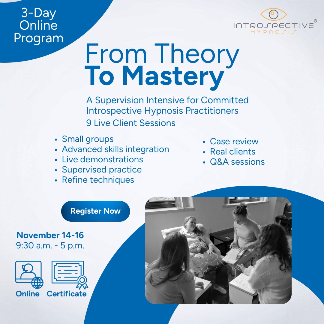 From Theory to Mastery: A 3-Day Supervision Intensive for Committed Introspective Hypnosis Practitioners. For experienced practitioners ready to refine their skills and expand their confidence through real client work.